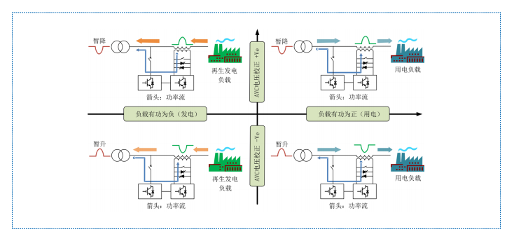 當(dāng)負(fù)載為發(fā)電狀態(tài)(有功功率為負(fù))時,電源側(cè)電壓發(fā)生暫升,整流器從電網(wǎng)側(cè)獲取能量,逆變器 又把獲取的能量通過變壓器注入到主回路中,以補(bǔ)償電壓的暫升。