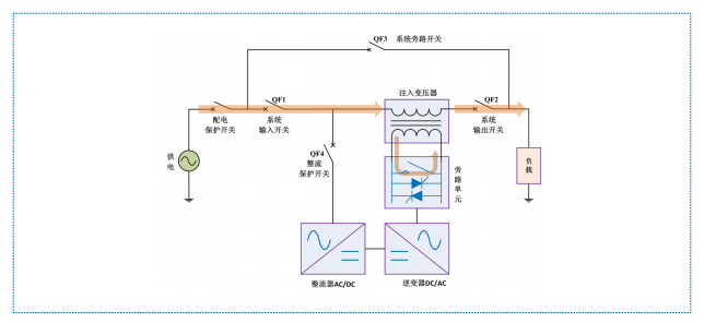 HTAVC 在自身設(shè)備發(fā)生故障時會自動轉(zhuǎn)為內(nèi)部旁路供電,旁路快速響應(yīng)由晶閘管切換完成,旁 路保持由機(jī)械觸點完成。此時,逆變器不生成補(bǔ)償電壓,市電通過注入變壓器主回路側(cè)繞組直接為負(fù)載供電。