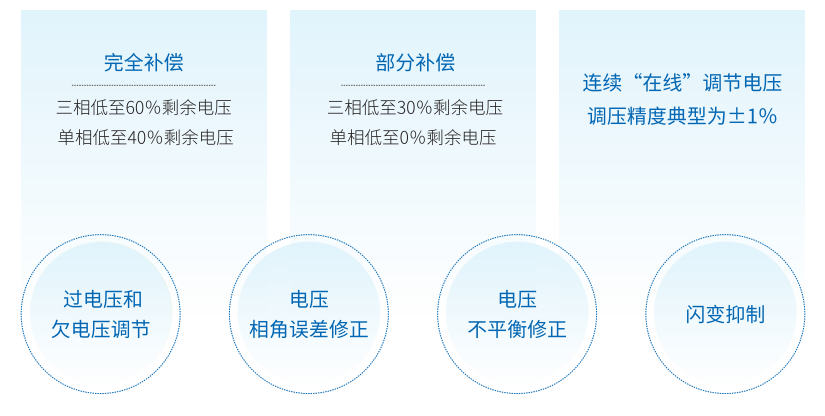 電壓暫降補(bǔ)償、電壓暫升補(bǔ)償、相角誤差修正、電壓不平衡修正、連續(xù)在線調(diào)壓、電壓波動與閃變