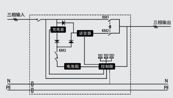 說(shuō)明:設(shè)備內(nèi)部由逆變器、充電器、電池組、控制器、切換器件KM1、KM2、KM3等構(gòu)成。
